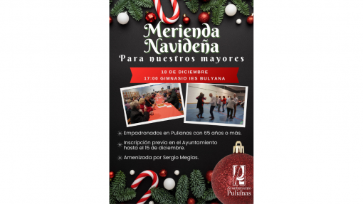 El 18 de diciembre a las 17:00h, en el Gimnasio del IES Bulyana, tendrá lugar la tradicional merienda navideña para los mayores de Pulianas. Una cita para compartir una tarde …