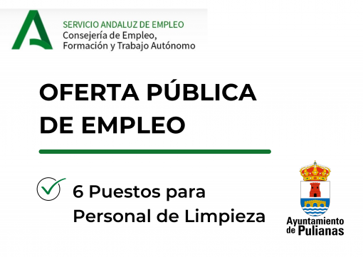 Oferta Pública de 6 plazas para personal de limpieza para el Ayuntamiento de Pulianas. Jornada completa y con una duración de 30 días. Los interesados podrán inscribirse a través de la ...