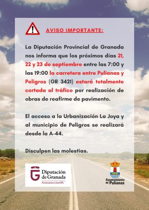 El Ayuntamiento de Pulianas informa del corte de la carretera GR 3421 que une Pulianas y Peligros, tendrá lugar los días 21,22 y 23 de Septiembre de 7:00 a 19:00 ...