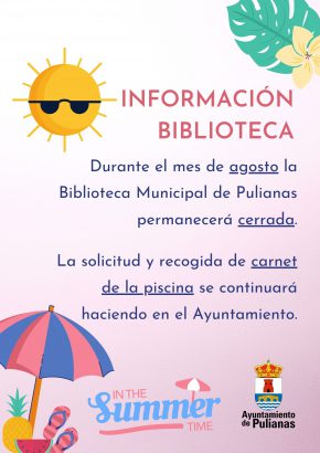 Durante el mes de agosto la Biblioteca Municipal de Pulianas permanecerá cerrada. Tanto la solicitud como la recogida de carnet de empadronado para la piscina se continuará realizando en el ...