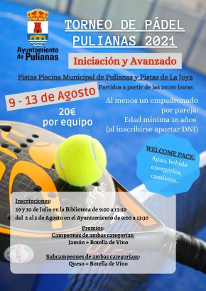 ¡DEL 9 AL 13 DE AGOSTO! Ya puedes inscribirte para el Torneo de Padel Pulianas 2021. El torneo se realizará del 9 al 13 de Agosto y consta de dos categorías: ...