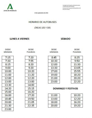 El Ayuntamiento de Pulianas informa que, desde hoy lunes 13 de Septiembre, se produce un cambio en las frecuencias de los autobuses de Pulianas, a continuación les indicamos el nuevo ...