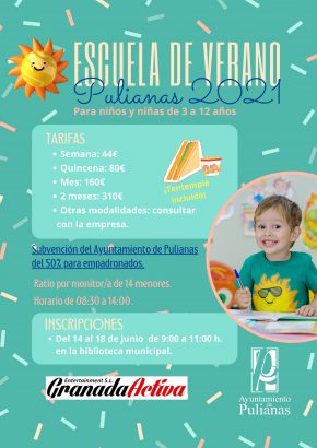Abiertas las inscripciones para la escuela de verano Pulianas 2021 para niños y niñas de 3 a 12 años. De lunes 14 de Junio a viernes 18 de Junio, en ...