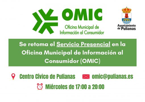 Se retoma el servicio presencial en la Oficina Municipal de Información al Consumidor (OMIC) Lugar: Centro Cívico de Pulianas Horario: Miércoles de 17:00 a 20:00 Contacto: omic@pulianas.es   (Pinche la ...