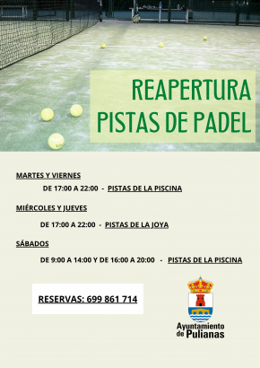REAPERTURA PISTAS DE PADEL De nuevo están disponibles tanto las pistas de padel de La Joya como las de la Piscina de Pulianas. Reservas en el 699861714.     (Pinche en ...