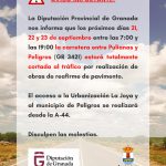 El Ayuntamiento de Pulianas informa del corte de la carretera GR 3421 que une Pulianas y Peligros, tendrá lugar los días 21,22 y 23 de Septiembre de 7:00 a 19:00 horas.
