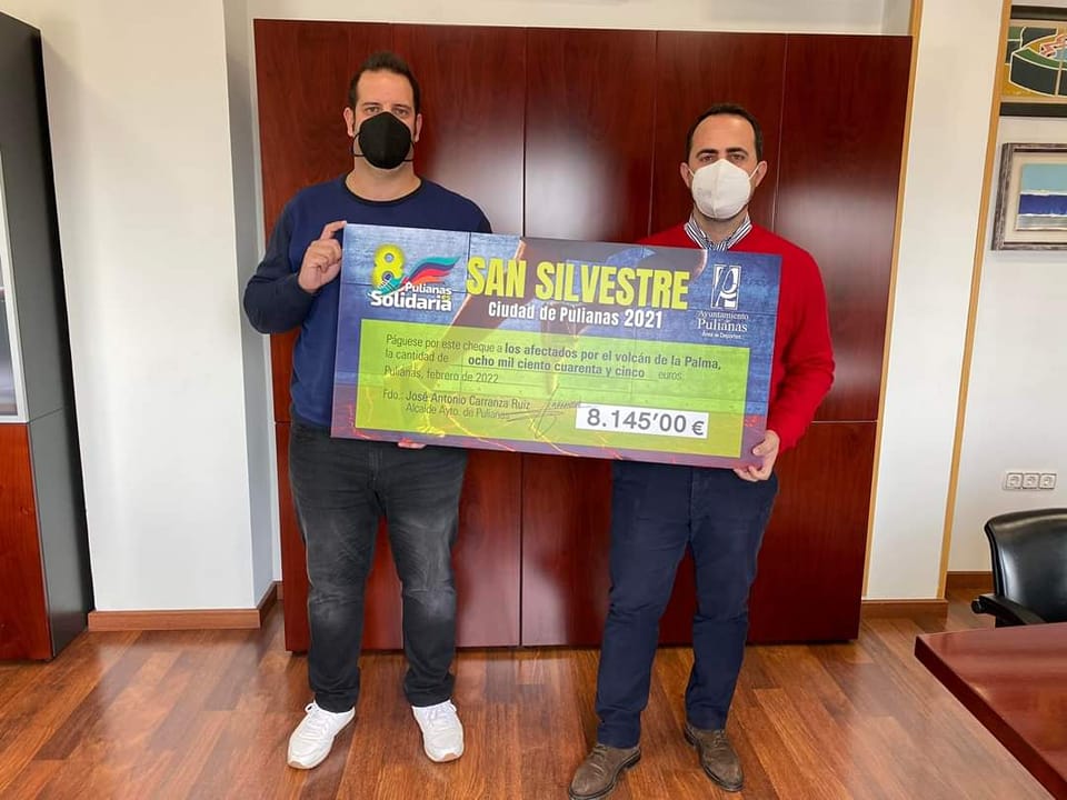 Nuestro Alcalde, José Antonio Carranza, junto con el concejal de Deportes, Javier Páramos han dado a conocer esta semana el importe total recaudado para los afectados de La Palma: 8.145€!! 1.000€ de la Feria de la Moda y 7.145€ en nuestra San Silvestre Ciudad de Pulianas 2021🏃🏻♀️🏃🏻 ¡todo un récord!