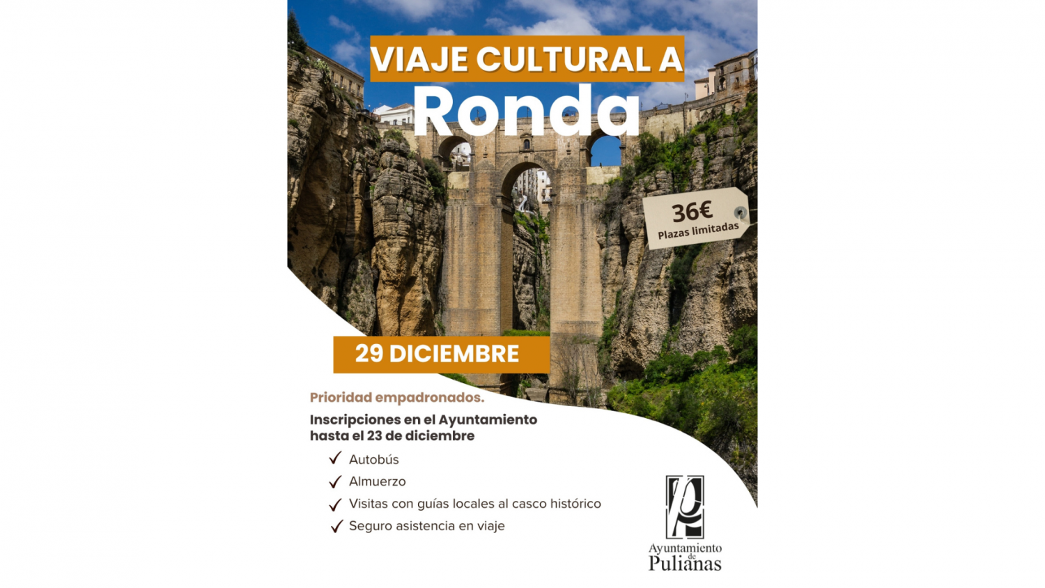 El próximo 𝟮𝟵 𝗱𝗲 𝗱𝗶𝗰𝗶𝗲𝗺𝗯𝗿𝗲 viajamos a 𝗥𝗼𝗻𝗱𝗮, una de las ciudades más bellas y emblemáticas de Andalucía, famosa por su impresionante patrimonio, sus tradiciones y su entorno natural.